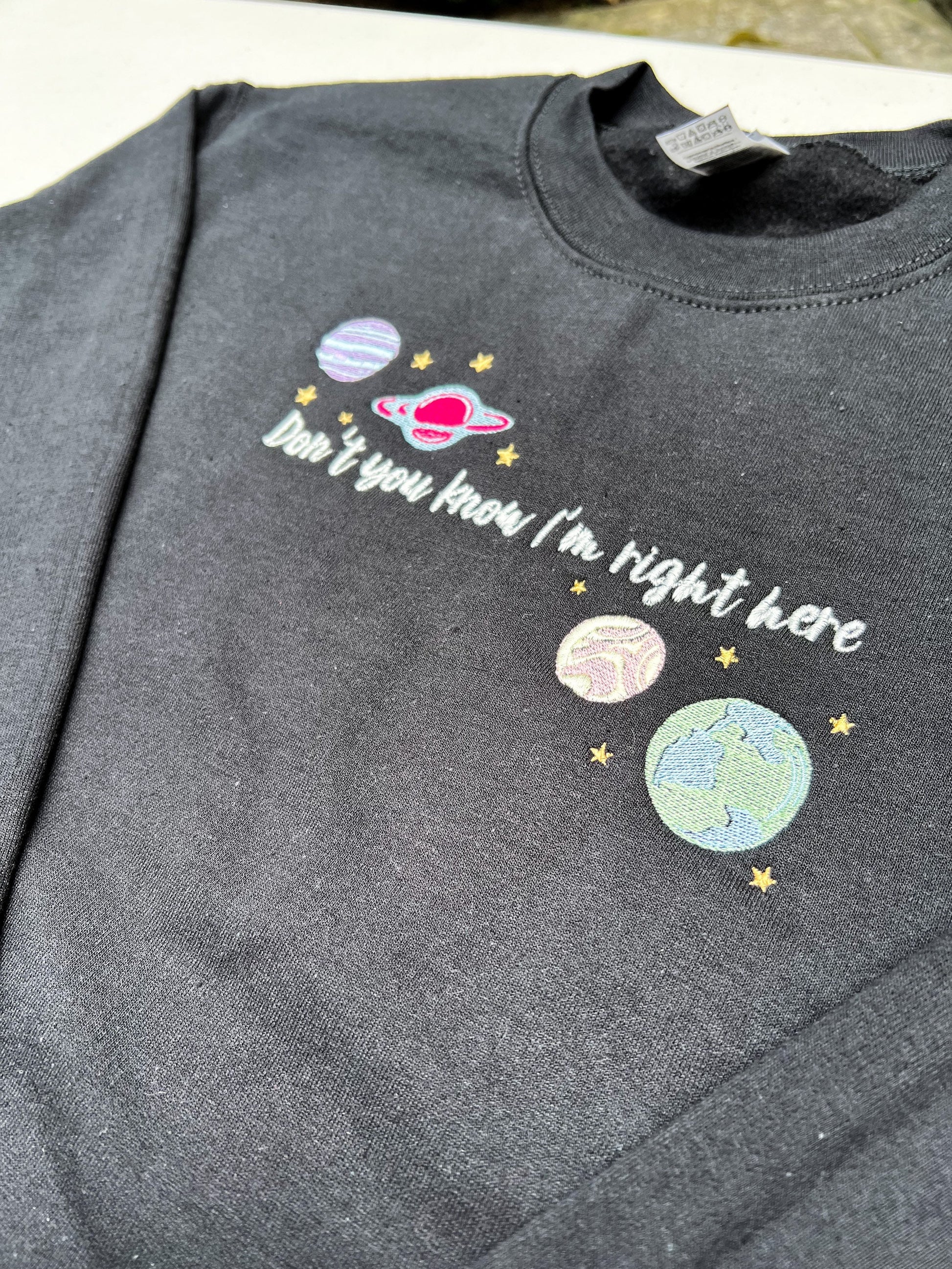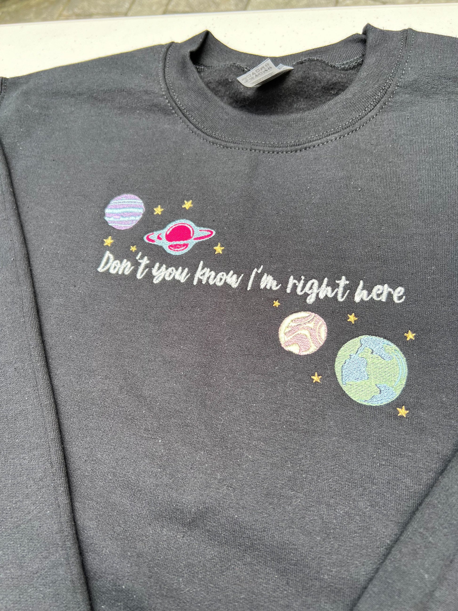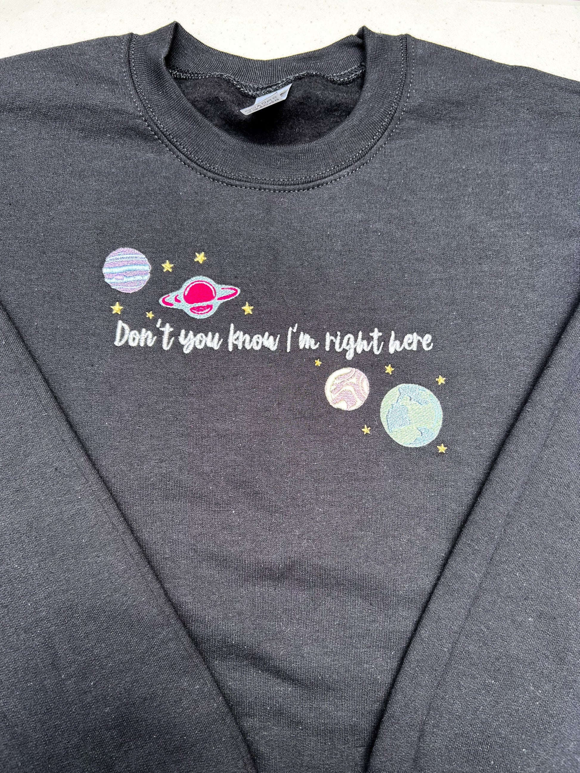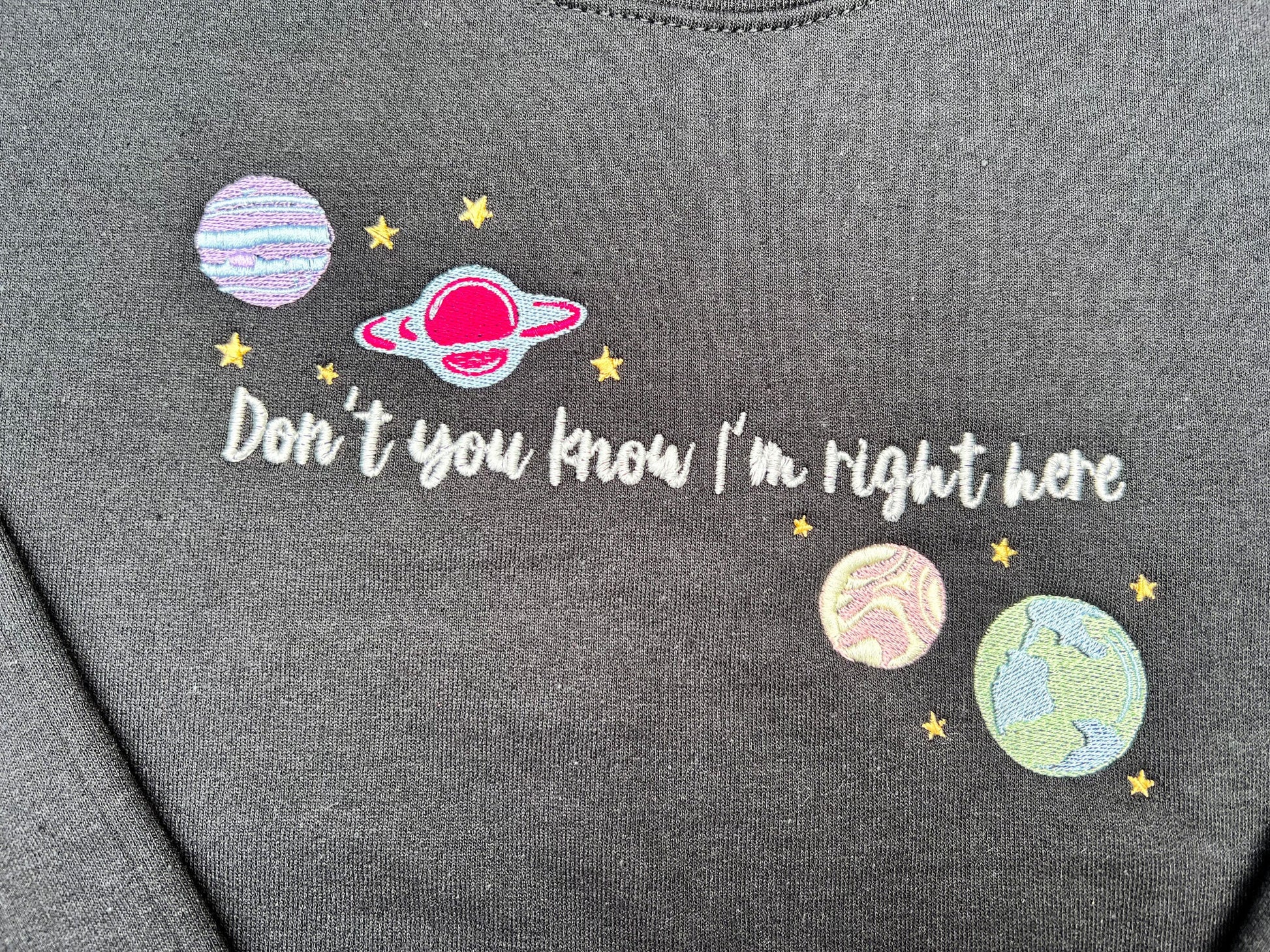 Embroidered design reads "Don't you know I'm right here" and is complimented by multi-colored planets.