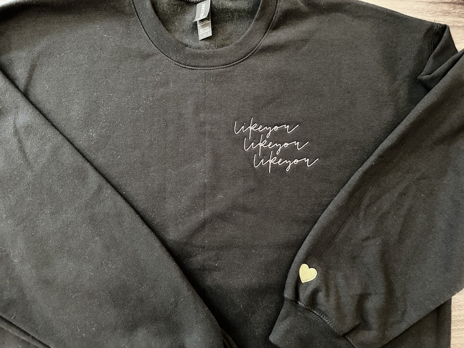 A beautiful embroidered sweatshirt that says "likeyou likeyou likeyou."