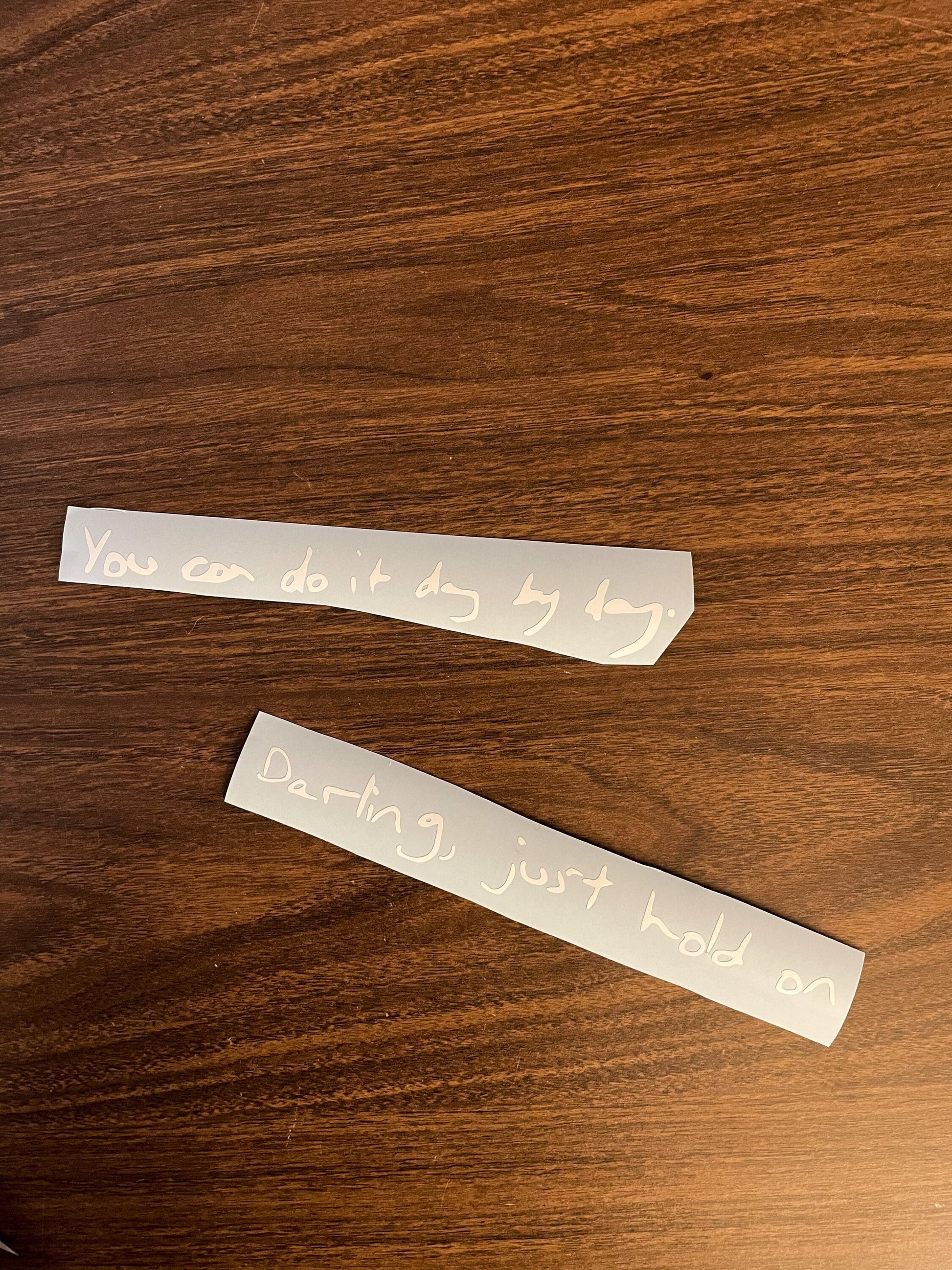 Two decals with iconic lyrics from two of Louis' most uplifting songs."You can do it day by day" and "Darling, just hold on."
