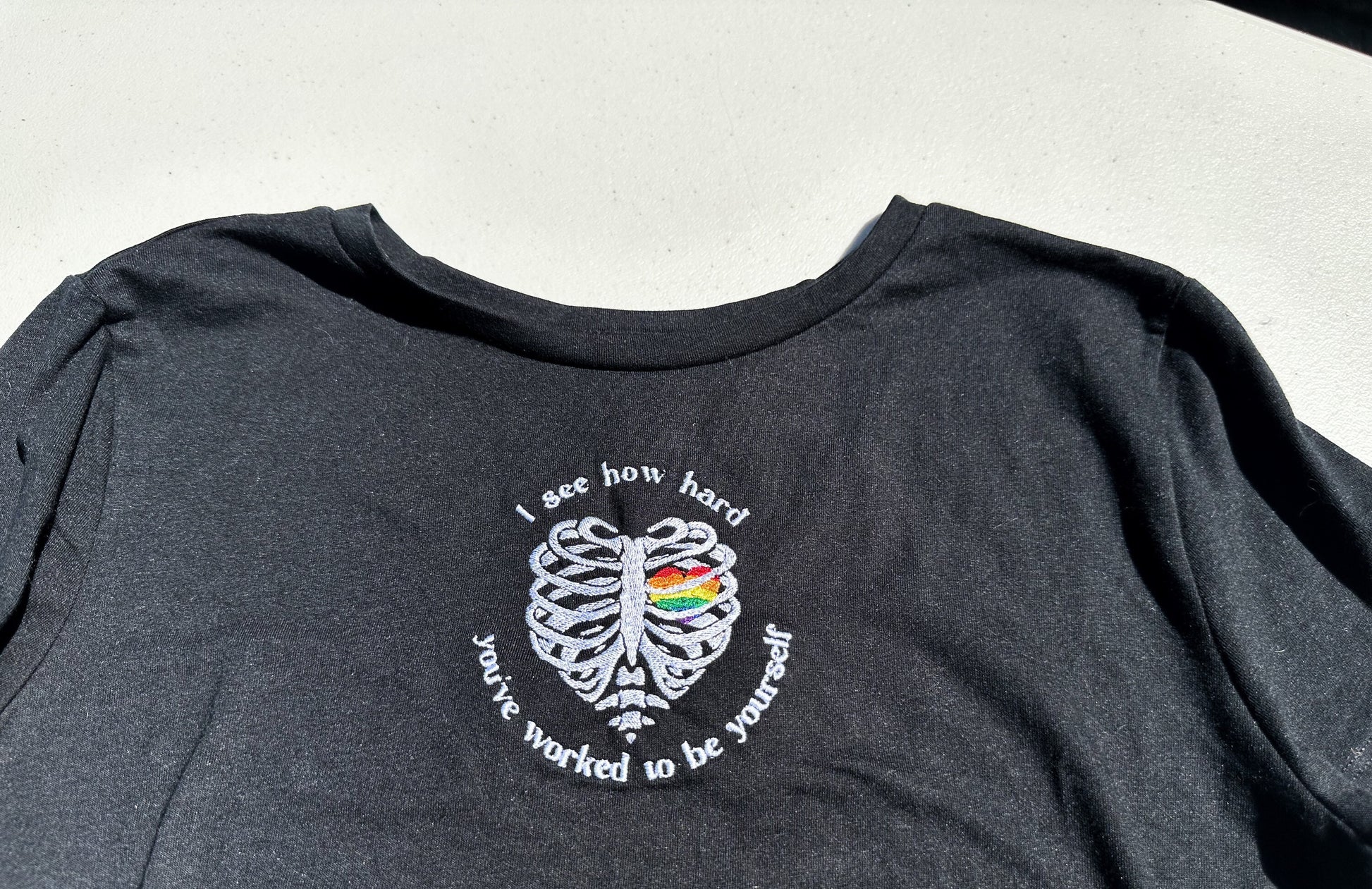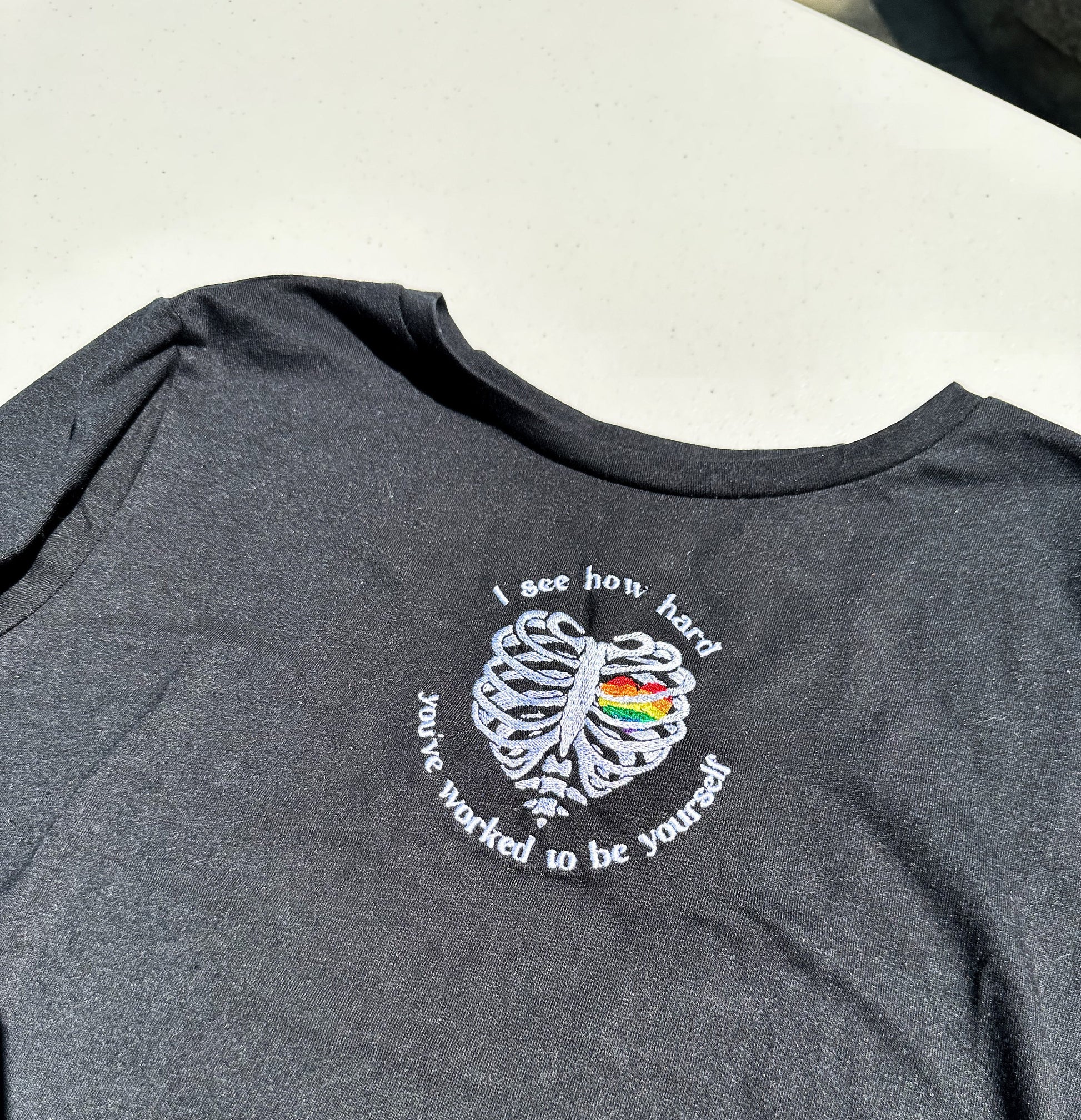 Skeleton ribs with a rainbow pride heart with the lyrics "I see how hard you've worked to be yourself".
