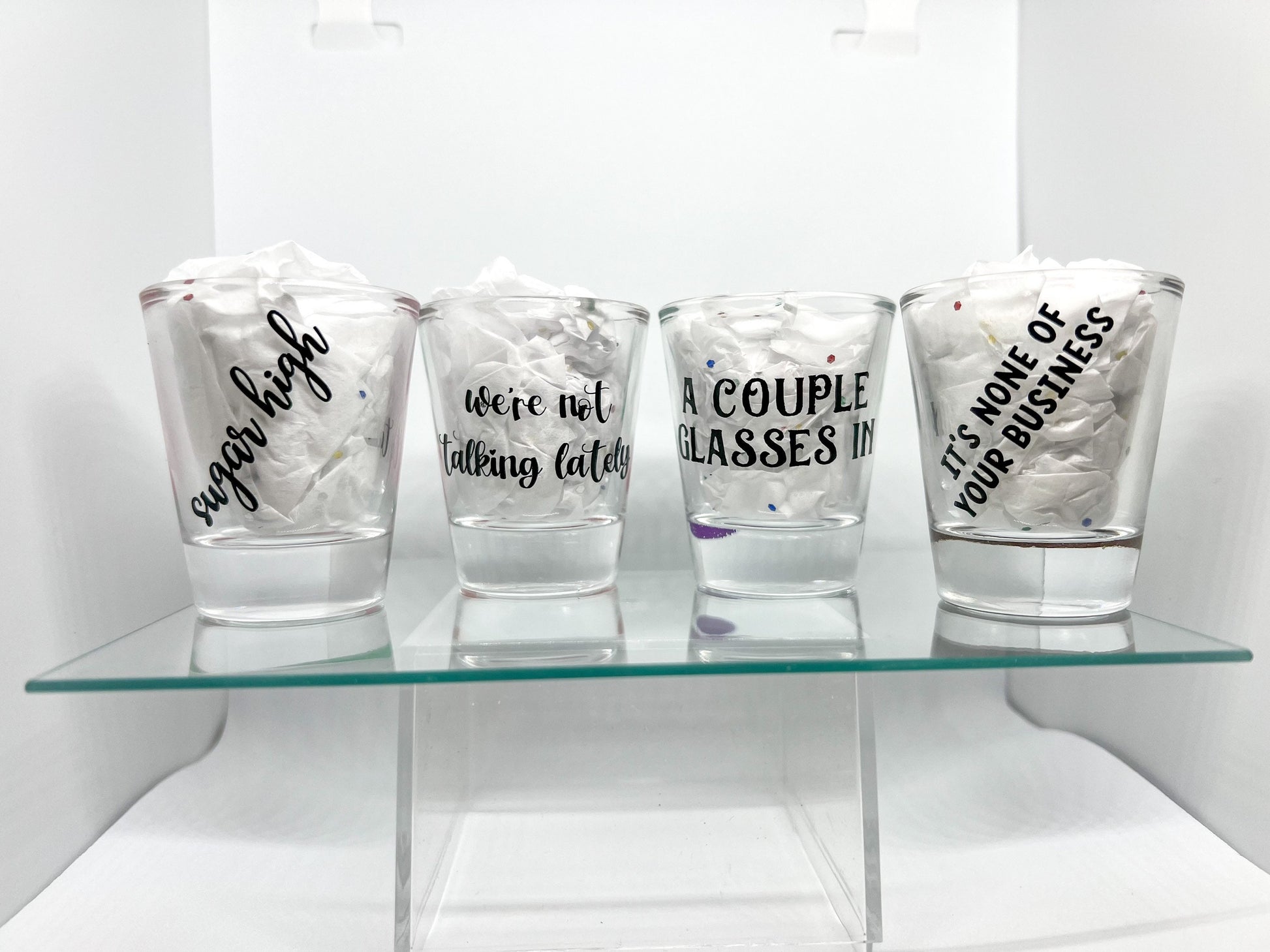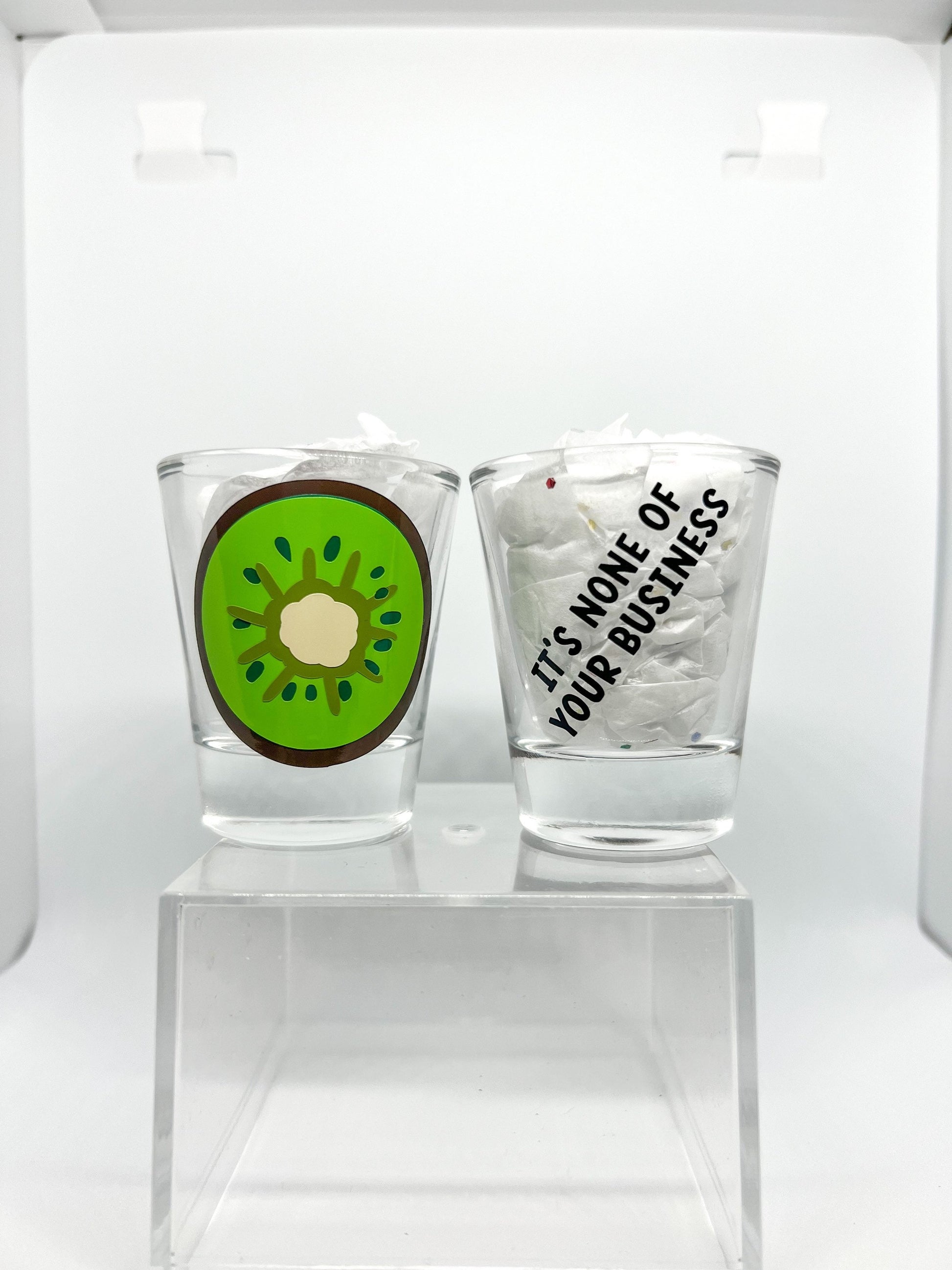 Pack of 4 Harry fruit inspired shot glasses.- Kiwi - "It's none of your business."